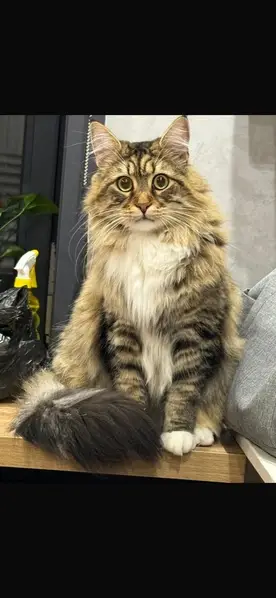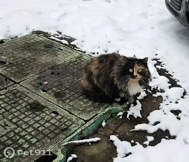 Трехцветная, на улице ходит и мяукает. Похожа на домашнюю.