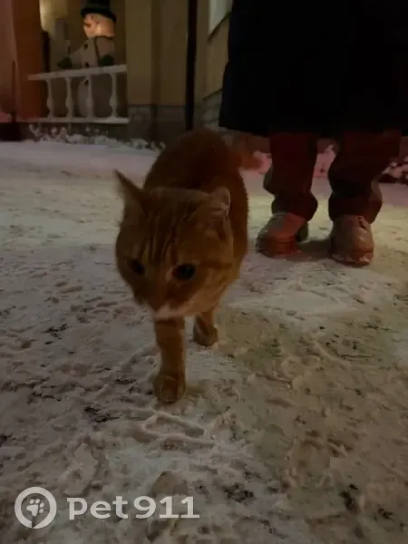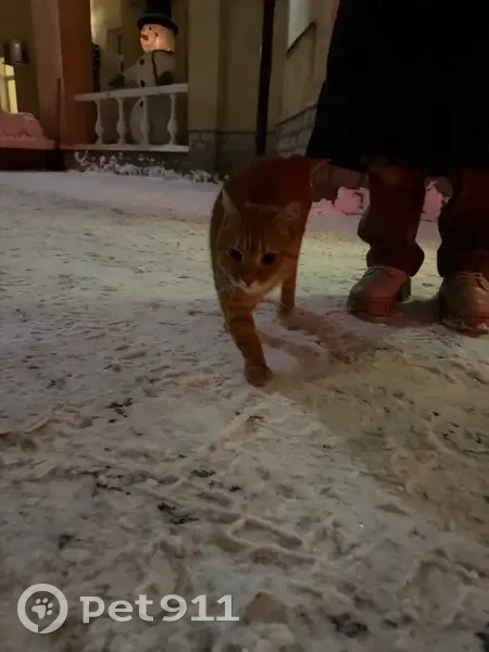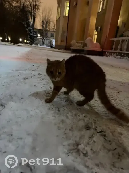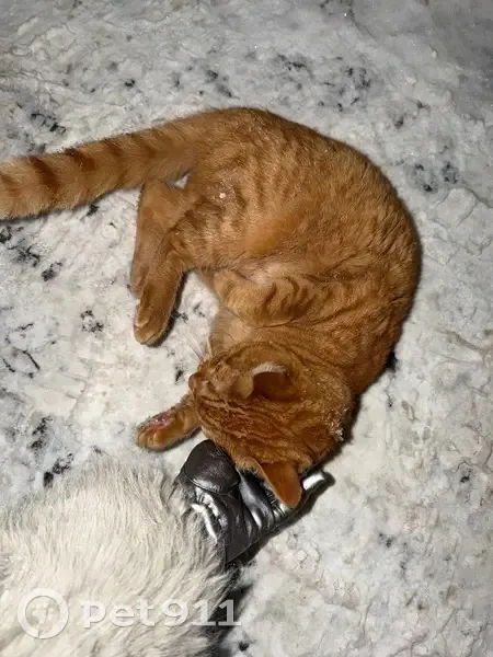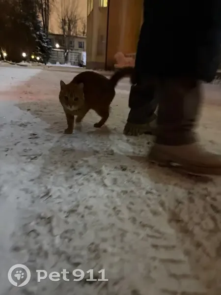 Рыжая небольшая кошка, очень ласковая и контактная, длинный хвост, очень напугана и мяукает. Ухоженная