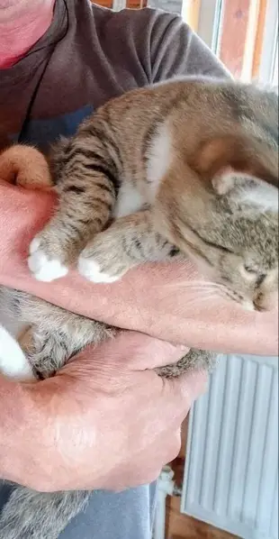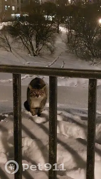 Котик или кошечка полосатая коричневая с белой грудкой, с ошейником. Сидела вечером на мосту на Перервенском бульваре.