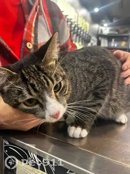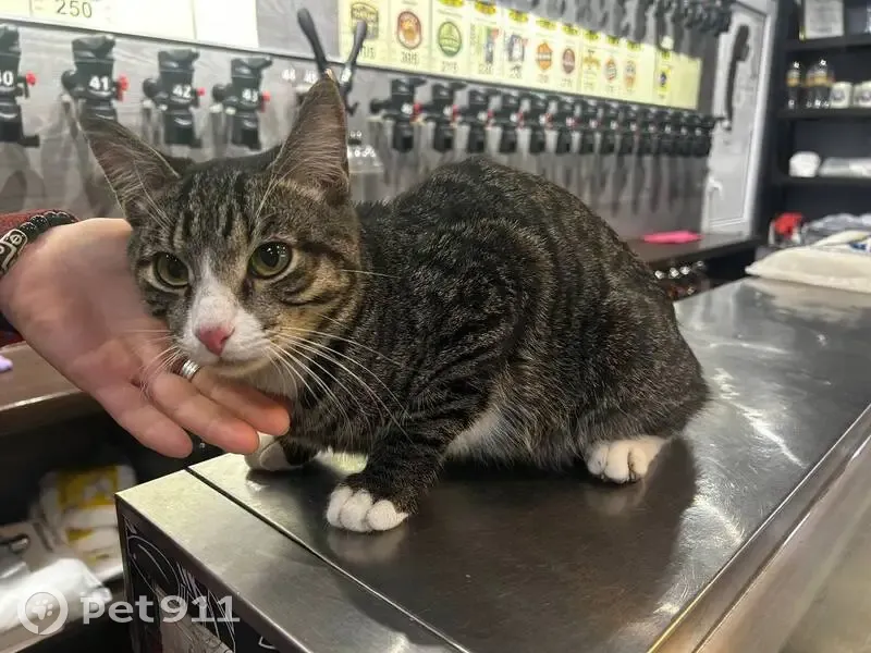Найден котик. Пришел в «Пивной рай». Спокойный,ласковый и чистый. По виду явно домашний. Хозяин заведения сказал,что оставить не может.