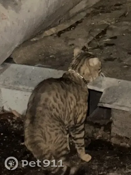 Кот cерый с полосками пятнами ( чем то бенгали напоминает ) с швейником( в заклепках стразах) и колокольчик на нем . , не кастрирован ️, Дает гладиться . Очень любит строить соседских Котов Может как недели 2 здесь обитает . Подкармливаем