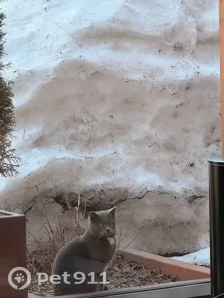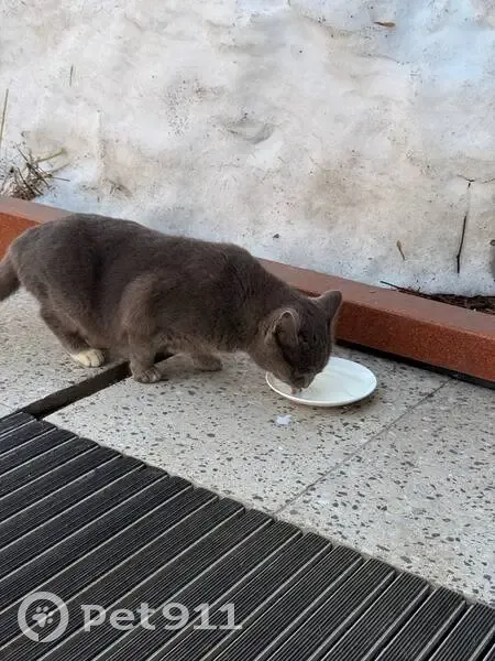 Кошка ходила по улице , вынесла молоко , теперь не отходит от здания. Голодная. Окрас серо - белый. Одна задняя лапка белая. Грудка белая. Глаза зеленые