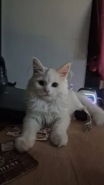 Найден кот в Москве в ЦАО. Прибился в подъезде. Пол точно не определили, но вроде кот. Белый кот с гетерохромией( правый глаз голубой, левый зелёно-коричневый), чистый, явно домашний.