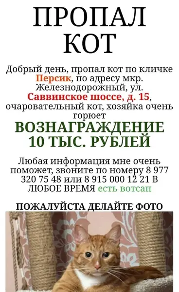 11 октября около дома номе 40 по Кронштадскому бульвару был найден котик молодой, домашний, очень ласковый и очень красивый. Он рыжий с белыми лапками. Очень ждёт, что его скоро найдут
