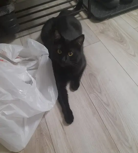 Найден котенок мальчик черного окраса , на ГАЭС , ему приблизительно 5-6 мес , бегал по улице за людьми , даже не боялся машин и выбежал на дорогу , бежал к магазину пятерочка , я его поймала и оставила сейчас у себя , ищу его хозяев , он явно потеряшка , видно , что он домашний
