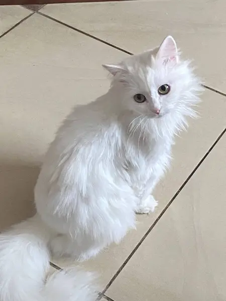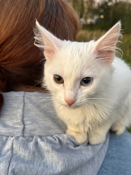 Найдена молодая кошечка, небольшая, белая, зелёные глазки, видимо какое-то время скиталась, на кончике хвоста кисточка, похожа на породу Ангорская. Сразу попросилась на ручки, ходит по пятам , очень смышлёная!!!! Может из другого района….