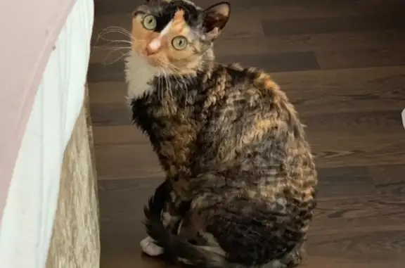 Трёхцветная кошка, розовый ошейник, явно домашняя. Видим её у дома 50,к 1 на Изюмской улице, район Южное Бутово, Москва.
