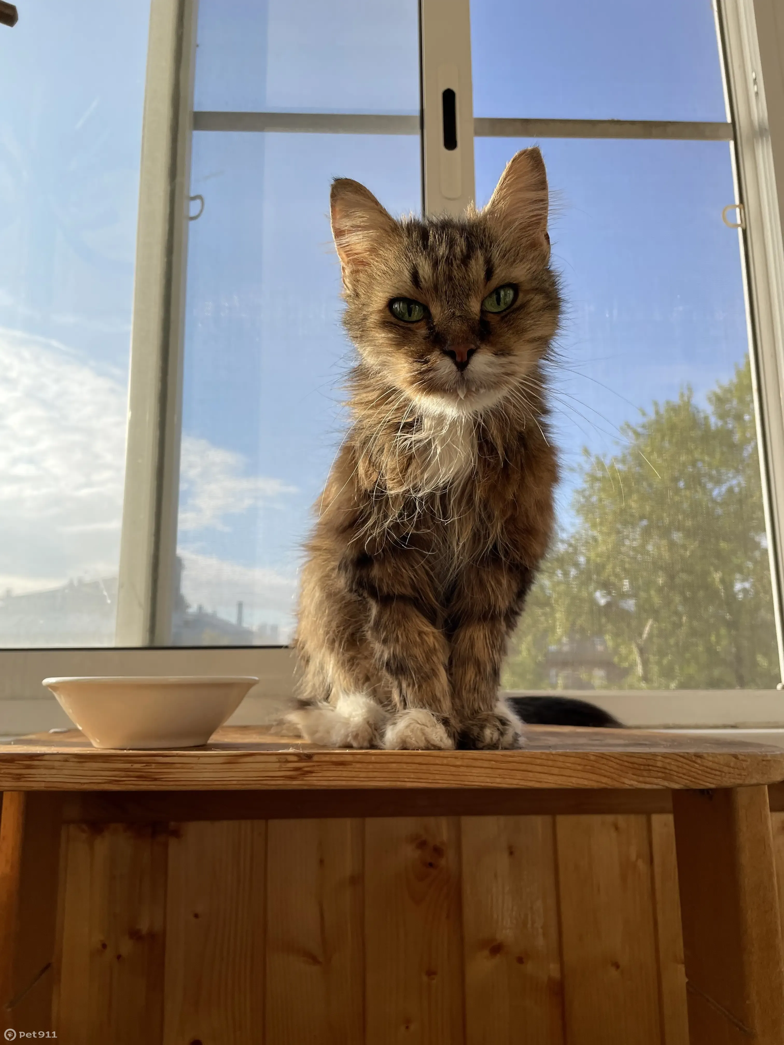 Кошка трехцветная, пушистая с зелёными глазами. Спокойная, ручная. Была найдена на территории спортивного комплекса "Серебряные Акулы", ул. Генерала Глаголева, 10к3.Ищем хозяина.