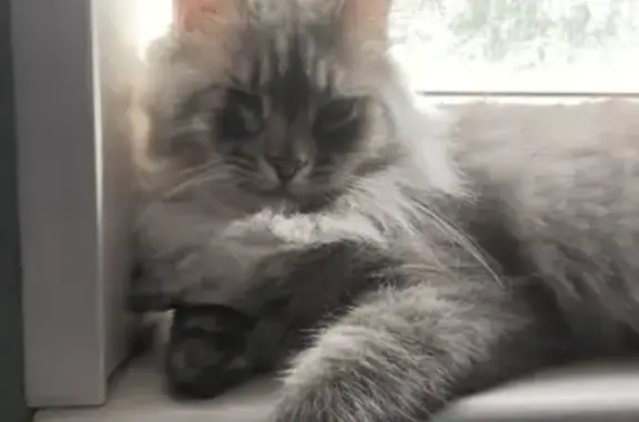 Найден в подъезде на верхнем техническом этаже. Животное крупное, окрас серый в полоску, "пушистик", имеется ошейник. По размерам похож на мейн-кунов, а по ушам - на вислоухих кошек.