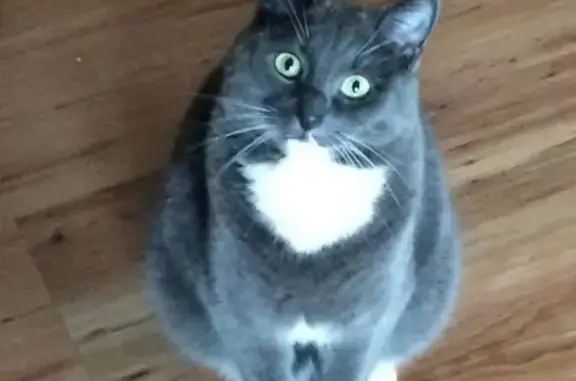 Найден молодой котик, серый, на морде пятнышко, белые кончики лапок, шейка, грудка и животик белые, средней пушистости, некастрированный, добрый, людей не боится. Найден на улице у жилого дома на уличной парковке, сидел на машине и потом ходил, как будто искал хозяина, проголодавшийся, но не тощий.