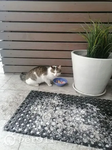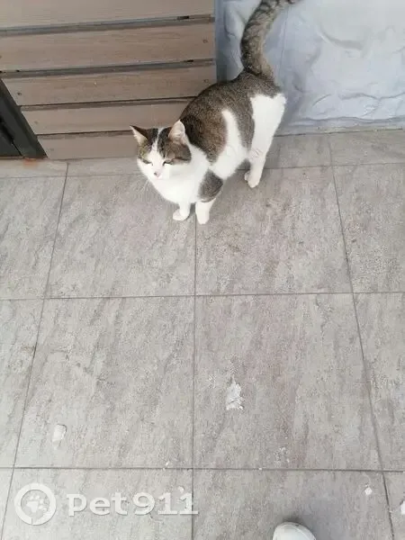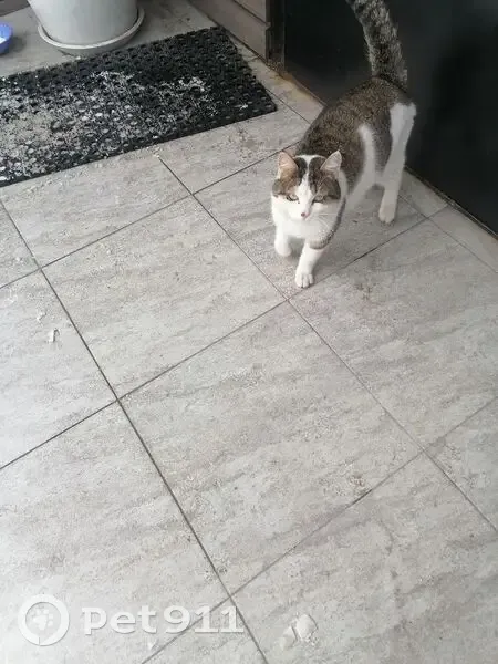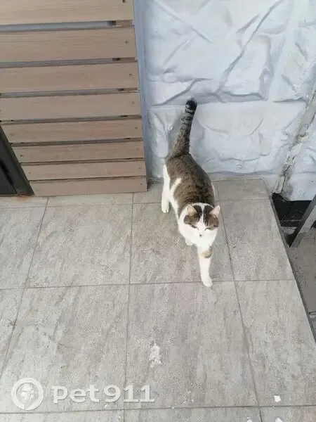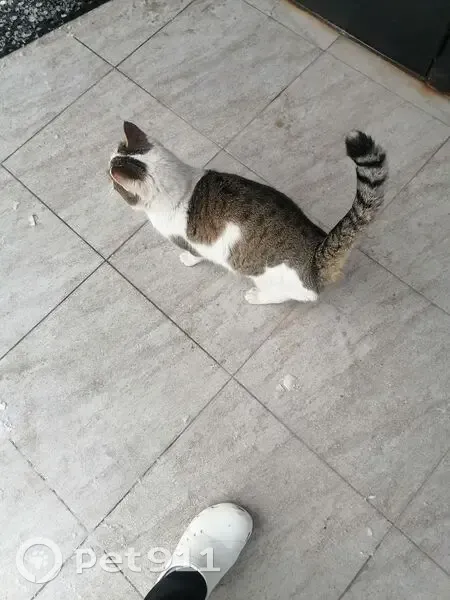 Кот белый с серым прибилсся к мед центру. 19.02 25 сидит под лестницей, выходит к людям, ласковый, ручной, явно домашний. Молодой, на носике пятнышко.