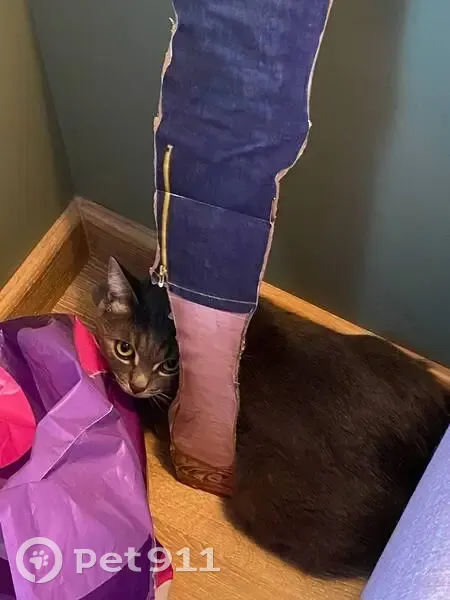 Серый, вроде, чистенький. Забежал в квартиру из подъезда, когда открыли дверь. Немного напуганная. Кошка или кот. Выяснит пока не удалось, так как питомец боится, не вылезает толком из-под дивана
