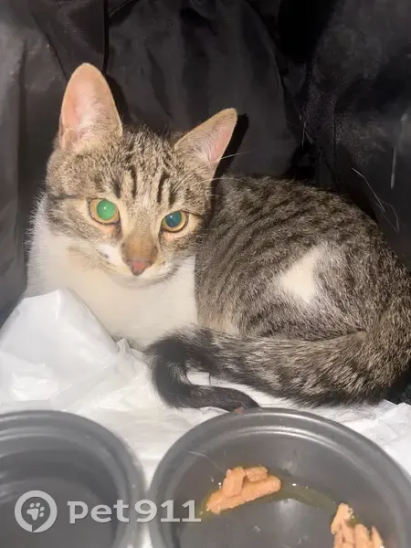 домашний котик . Сам полосатый ,глаза рыжие ,грудка белая,кончики лапок тоже белые .Вроде мальчик .
