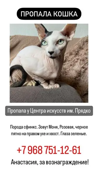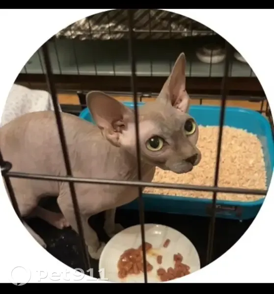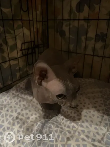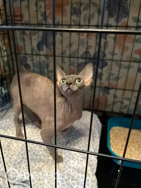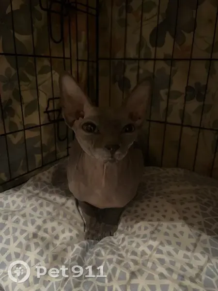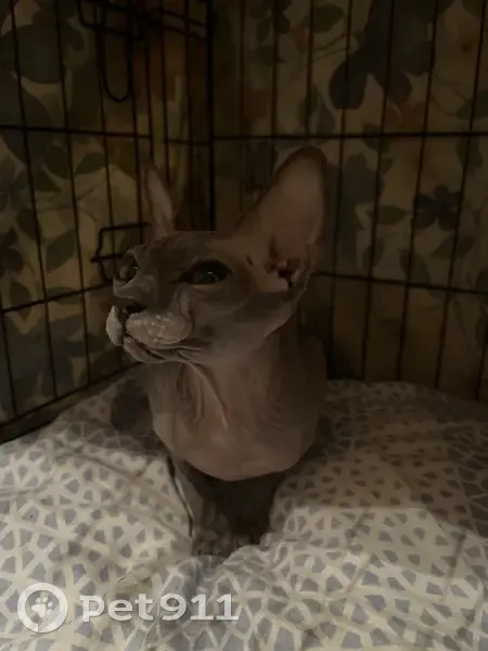 Кошка породы Сфинкс. На вид 2-4 года (но очень маленькая). Найдена 21 апреля в 2:30 ночи во дворе дома (Корнейчука 24) под машиной. Очень громко мяукала и активно пряталась. Очень ласковая и неагрессивная. В основном серая, но есть пятно светло-рыжего цвета на морде (не уверена). Нет усов. Зеленые глаза. Чипа нет.