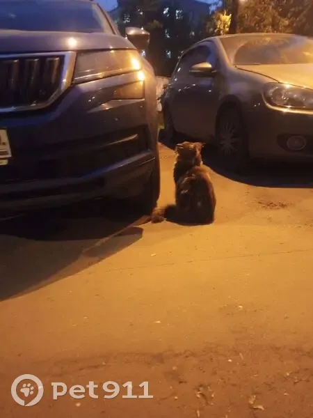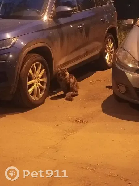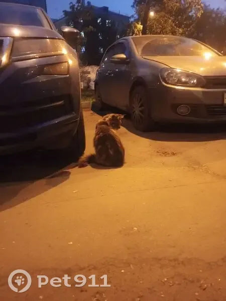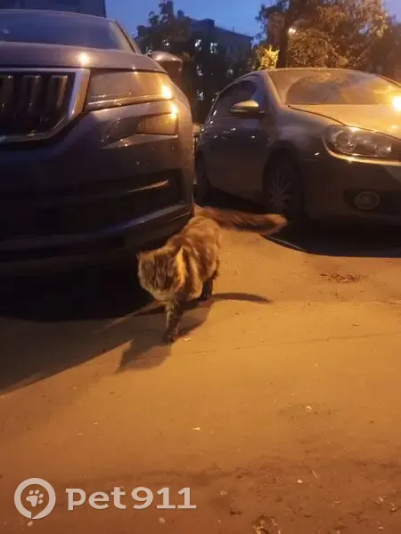 Мейнкун, проживает во дворе более двух месяцев, на нее серебристый брелок, похожий на пулю размером, окрас чёрный с серым