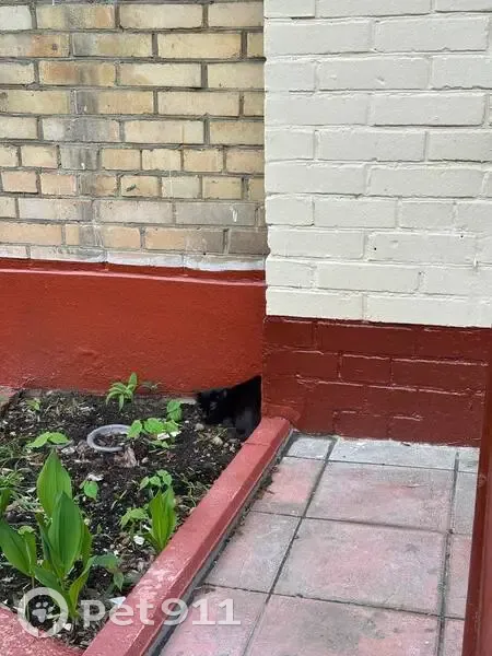 Черный окрас. На вид домашняя. Забилась в угол и не двигается. При попытке контактировать начинает мяукать. Сидит к третьего подъезда под окнами. Ул. Габричевского 6к1.