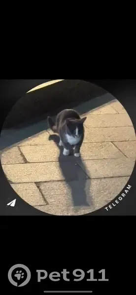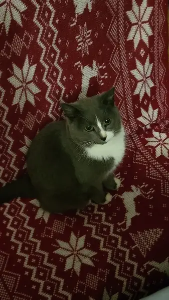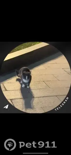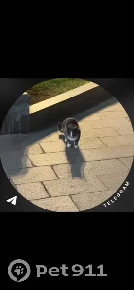 Серая, белая мордочка, грудь и лапки. Очень ухоженная и чистая, видно, что домашняя, пугливая.