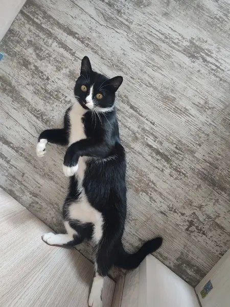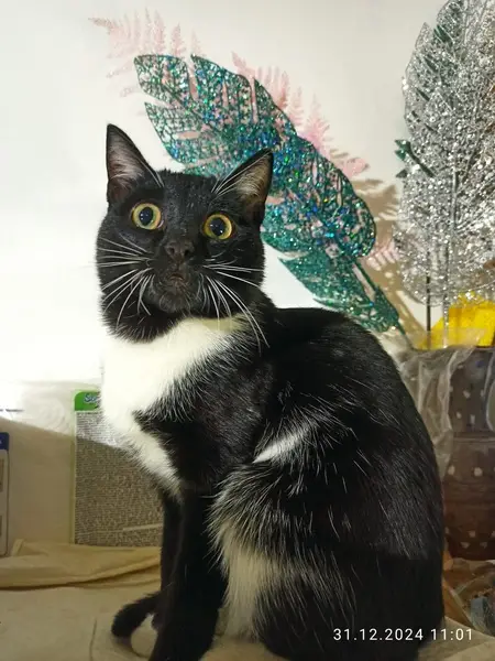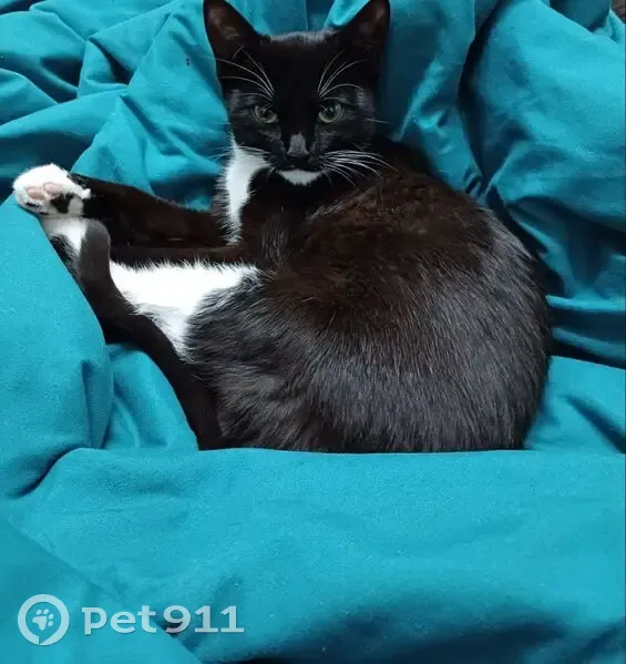Черно белая с белым галстуком кошка с носочками на передних лапках и задних гольфиках, найдена под лавочкой на детской площадке, очень ласковая, не боится никого.