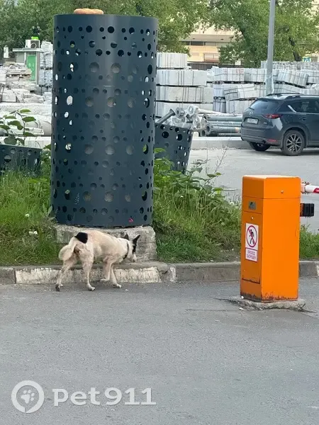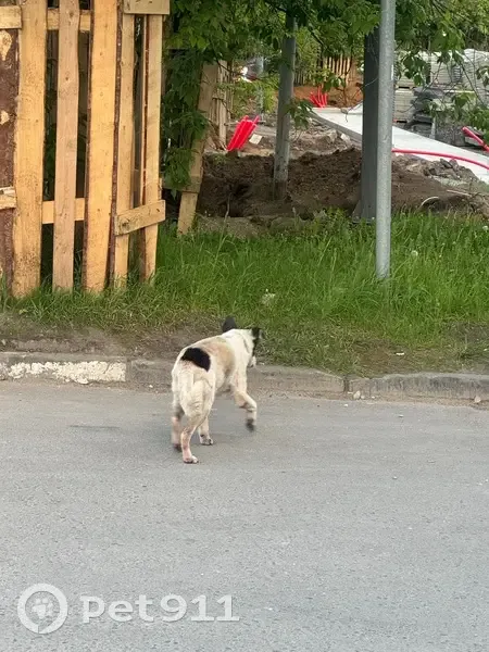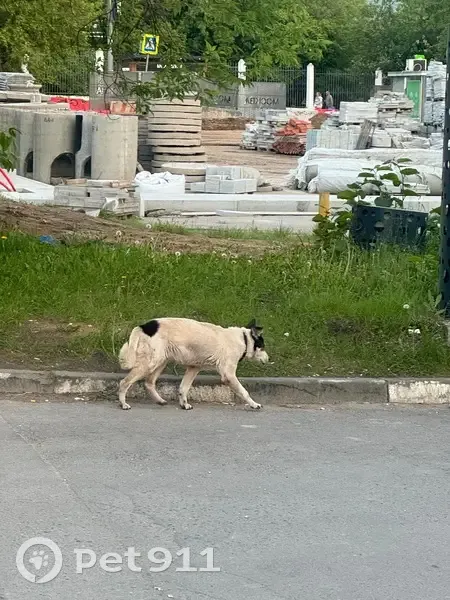 Белый щенок с черными пятнами, сам в черном ошейнике, грязный и потрепанный. На первый взгляд не ранен и не напуган. Бегал и нюхал деревья.