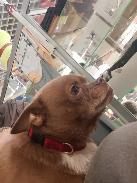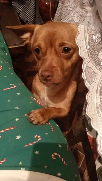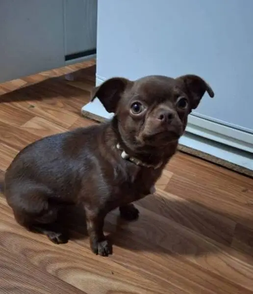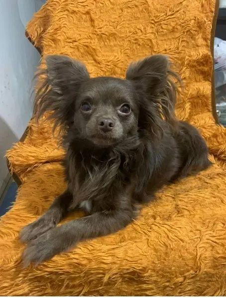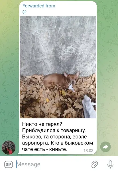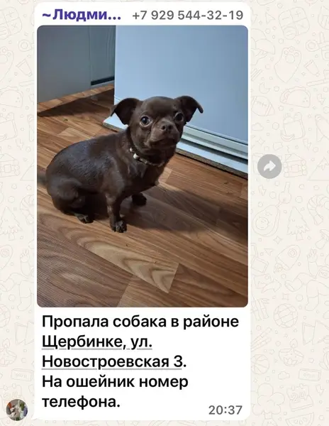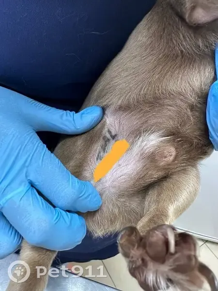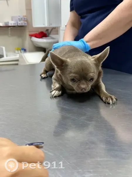 Чихуахуа коричневого цвета предположительно тип Коби Найден в кустах в районе Лерновской рощи рядом с ВДНХ, недалеко от метро Ботанический сад Код клейма TML Предположительно до 1.5 годиков, зубы молочные, не кастрирован, не чипирован. Весьма упитанный. Передние лапки разного цвета, правая светлая, левая коричневая Был без поводка и ошейника