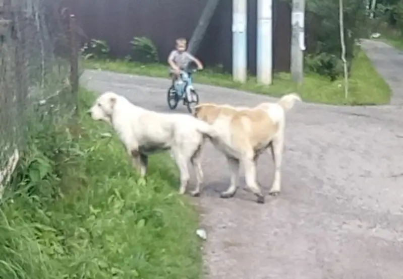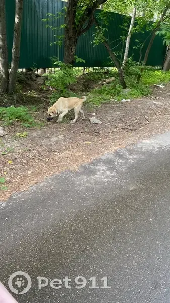 Увидели собаку, щенок но он достаточный крупный, у него был ошейник светло зеленый, у него большие лапы, был очень игривым, мы гуляли на этой улице он выбежал с травы и начал с нами играть бегать за нами потом переключился на другого прохожего