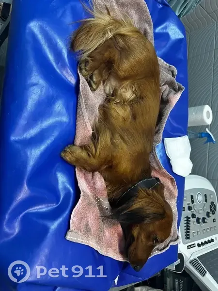 Собака перебегала Ленинский проспект, была сбита. Длинношерстная такса. Спокойный мальчик, судя по всему молодой, был в черном ошейнике без адресника и чипа (есть клеймо на ухе)