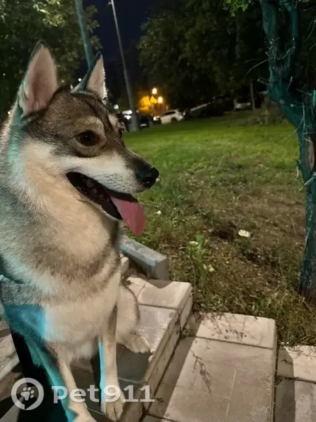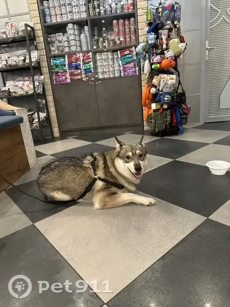 Метис хаски/лайки, молодой ухоженный кобель. Активный, умный, бегал один в районе ходынского бульвара. На нем была черная шлейка