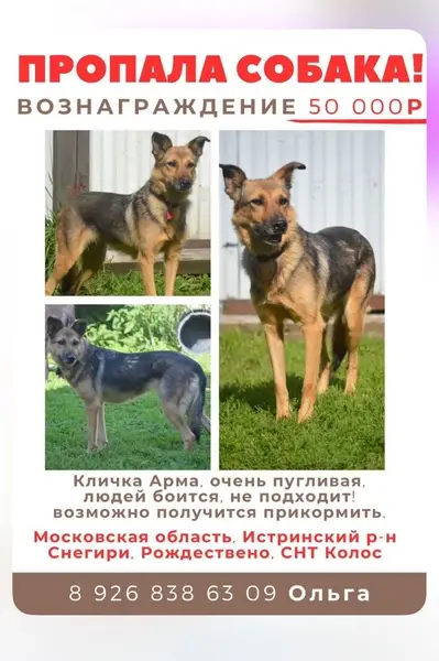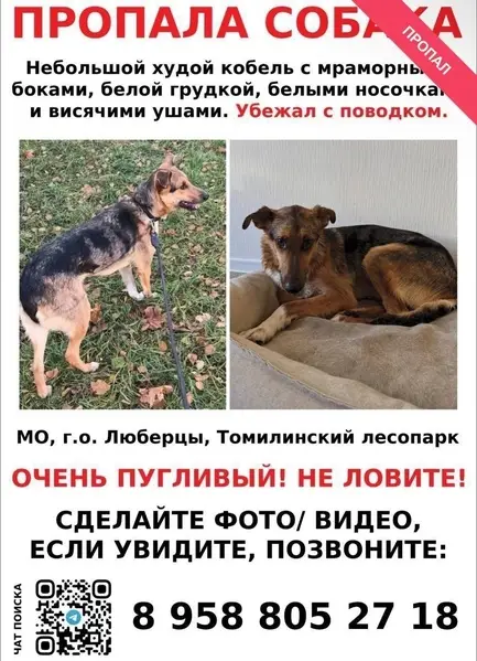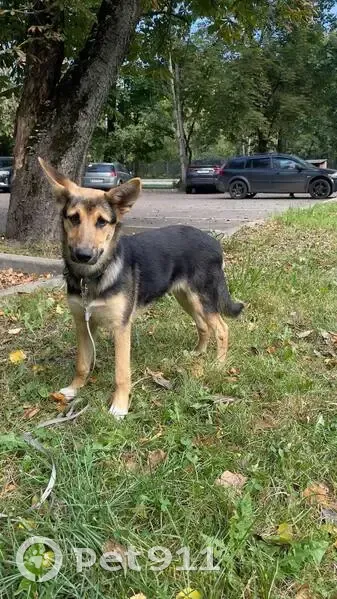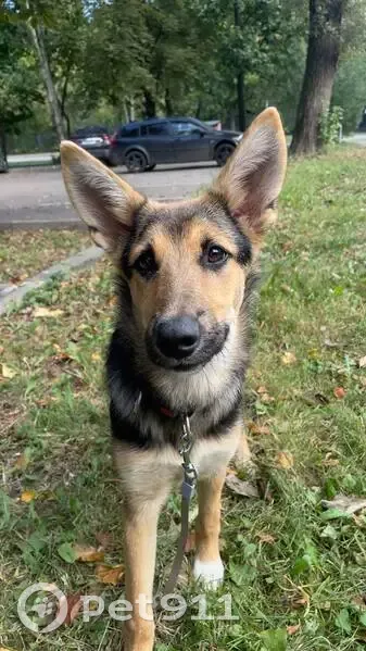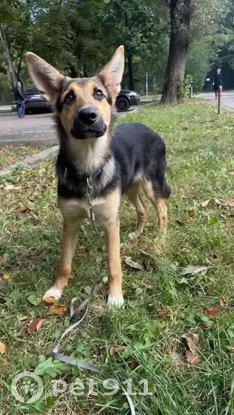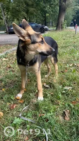 Метис, девочка, зубы сменились, молочные клыки ещё не выпали, фенотип овчарки, на ней был голубой ошейник "rukka". Добрая, но осторожная, к людям подходила, бегала за всеми хвостиком, в руки не давалась, в течение 1,5 часов с этого радиуса никуда не убежала - подозреваю, что живет неподалеку. Мне удалось придержать её, временно взяла к себе. На поводке в незнакомом месте дошла отлично, попила и поела из миски, утром пописала на пеленку, знает игрушки, явно домашняя.