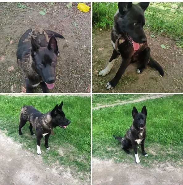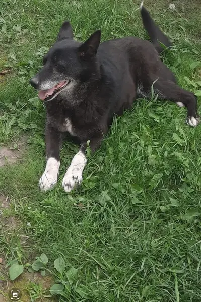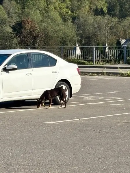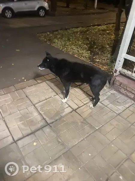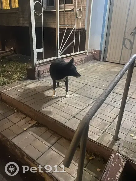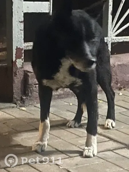 Черный песик, с белыми лапками и грудкой. Собака третий день сидит у второго подъезда и ждёт хозяина , никуда не уходит