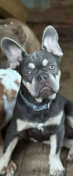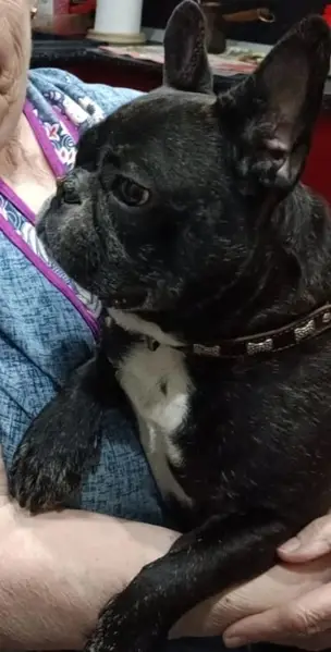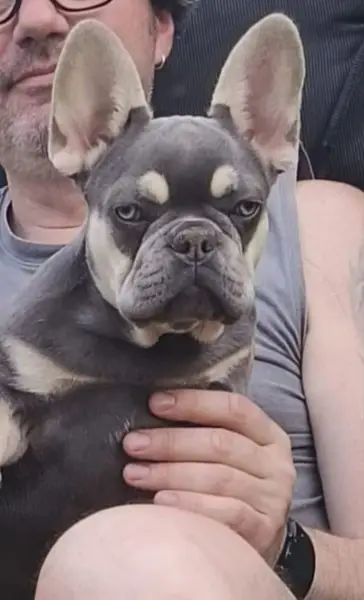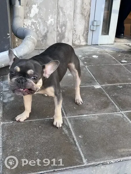 Предположительно щенок французского бульдога, неопределенного пола, без ошейника, темно-коричневый (ближе к серному) с желтоватыми пятнами на груди, бровях и лапках