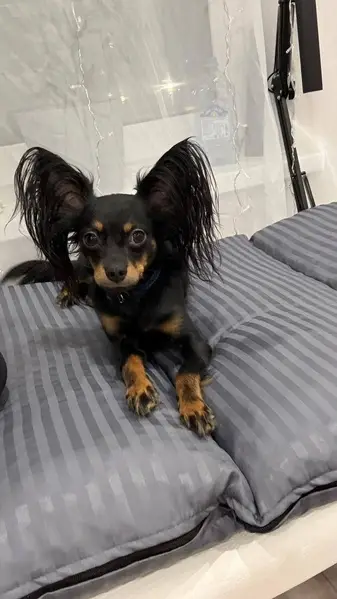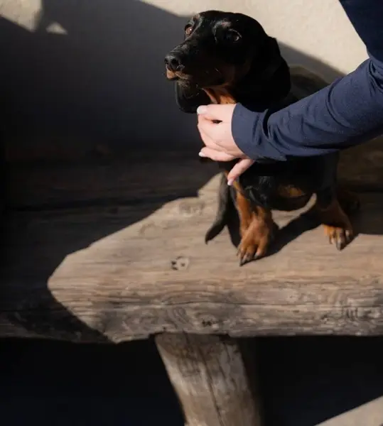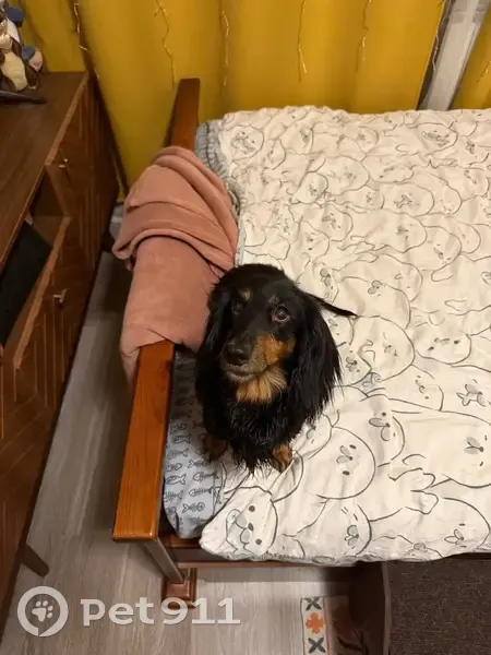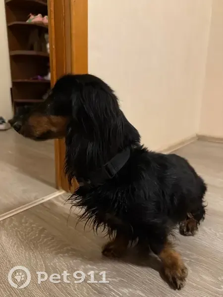 Такса,девочка, окрас черно-рыжий. Ухоженная, чистая. На задних лапах по 6 пальцев. В черном ошейнике, без адресника, поводка и тд