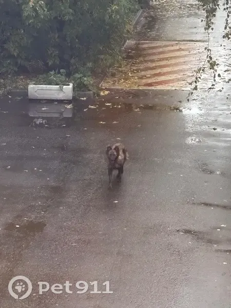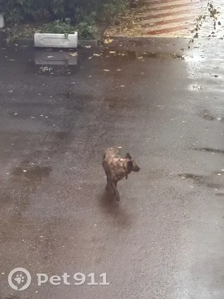 Замечена собака во дворе. Окрас - коричневый с черными пятнами. На шее ошейник с куском оторванного поводка. Бегает по двору, пытается зайти в подъезд. Замечена около 15:00 дня. Возможно пришла из далека, потому что очень грязная и мокрая.