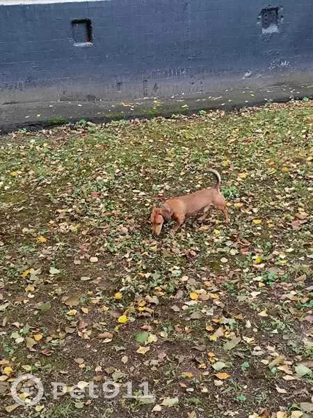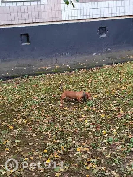 Рыжий кобель таксы. Некрупный, молоденький, но не щенок. Бегал под окнами домов и по детской площадке. Грязный, голодный, испытывал жажду. Отмыт, накормлен, ждёт своих хозяев.