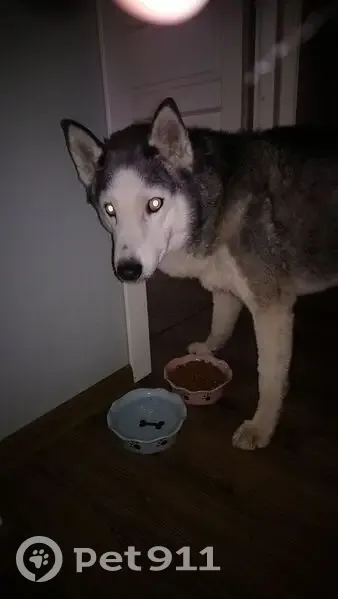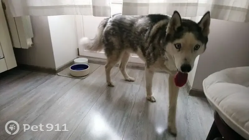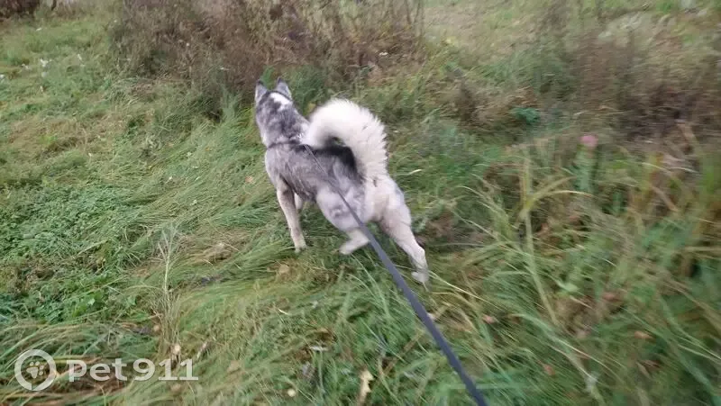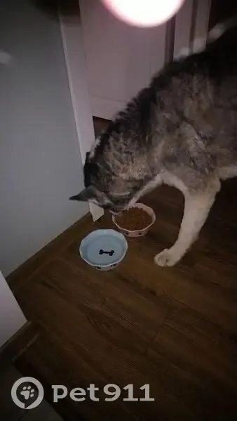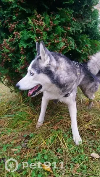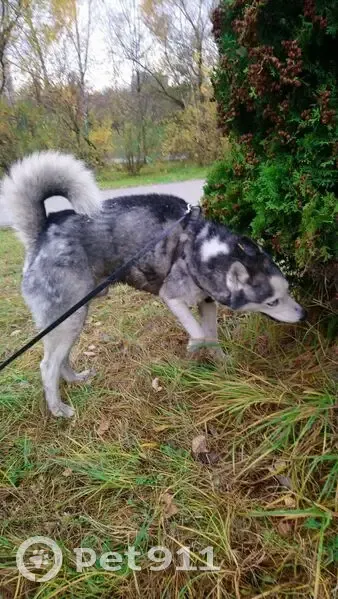 Кобель не кострирован. Серый окрас есть белое пятно на загривке. Чипа нет. Глаза серо голубые пучеглазый.