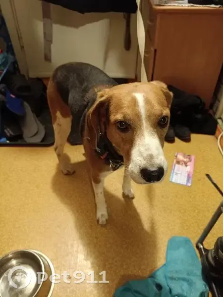 Москва, Щербинка. Найден бигль или эстонская гончая, мальчик, чипа нет, клейма на ушах нет, живот посмотреть не удается, ошейник черно- коричневый с красной строчкой и резинкой розовой, старый, застегнут свободно. На вид года 2-3. Найден на дороге при выезде из Щербинки! Явно домашний, знает подъезд и лестницу, сам садится в машину.
