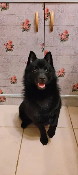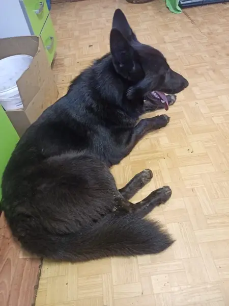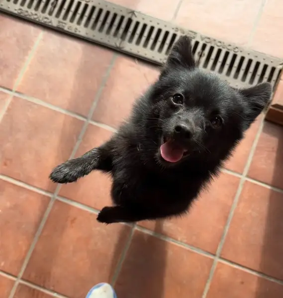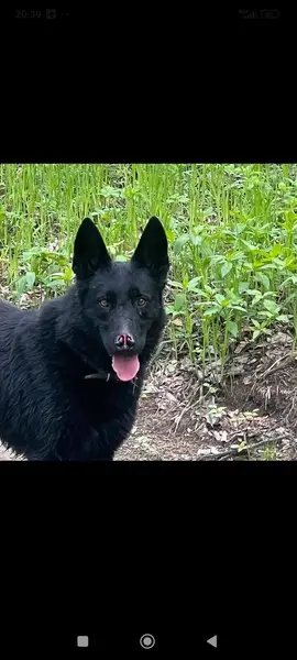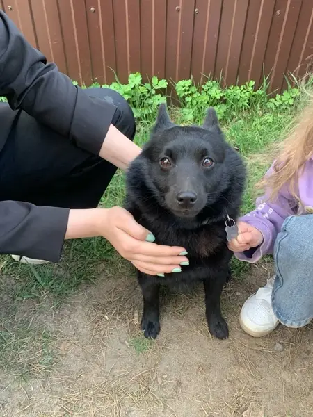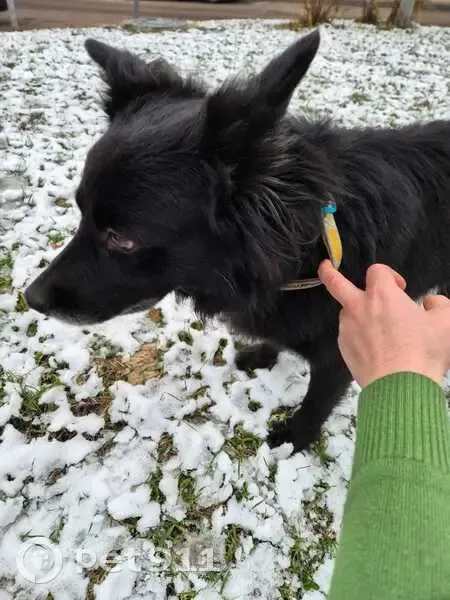 черная собака в ярком пестром ошейнике. Нижняя часть морды седоватая, сама собака чуть пушистая, хвост крючком. Уже неделю минимум бегает между нашими домами и ищет хозяина(