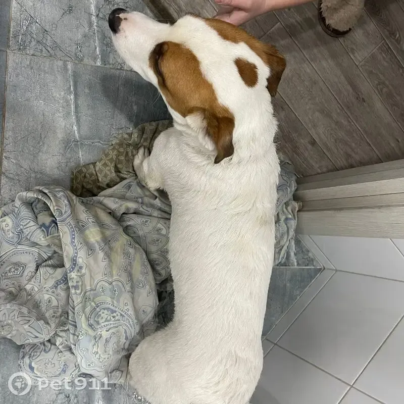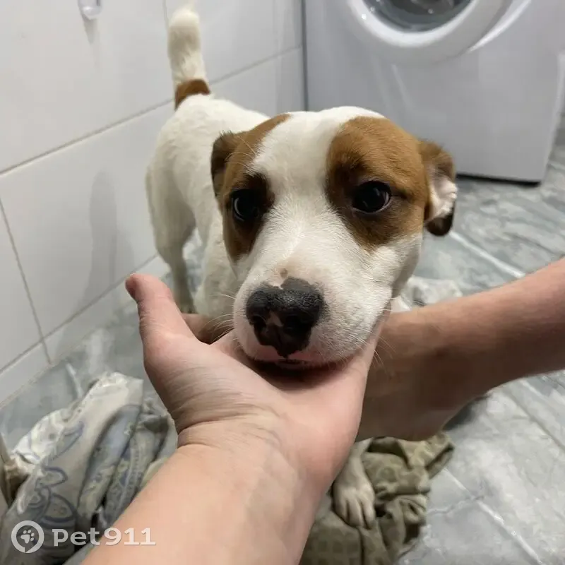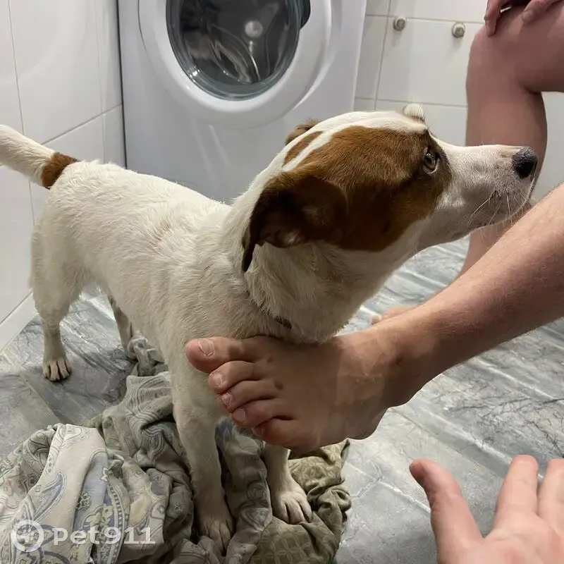 Взрослый Джек с ошейником об блох и клещей. Оказался внутри нашего подъезда в пятиэтажке. Явно домашний. Характер смирный. Возможно, на улице несколько дней