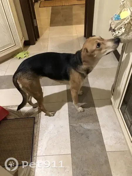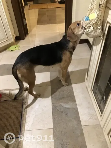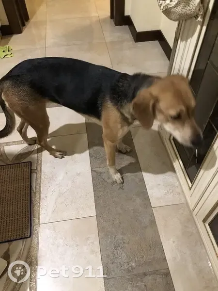 Найдена собака на уровне улица гарибальди д.7, собака домашняя, окрас коричневоо-черная, молодая девочка, была в попонке коричневого цвета с красным ошейником