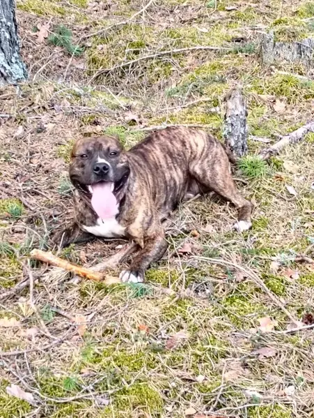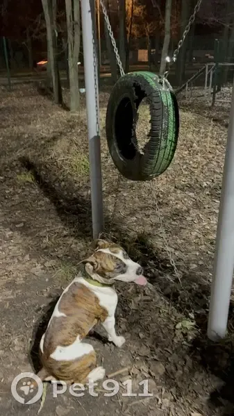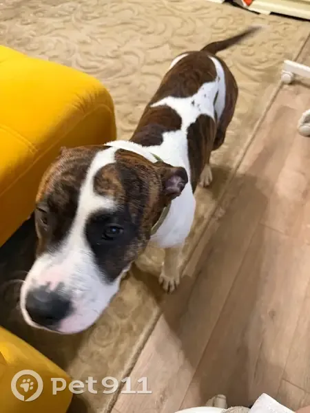 Пес бегал по улице, вёл себя дружелюбно, но был перевозбужден. В ошейнике. Похож на Стафа. Около года, но могу ошибаться. Пока приютили у себя. Окрас белый с коричневым