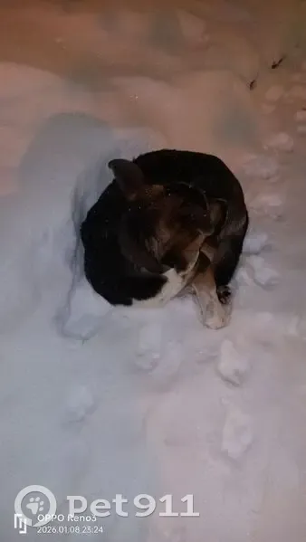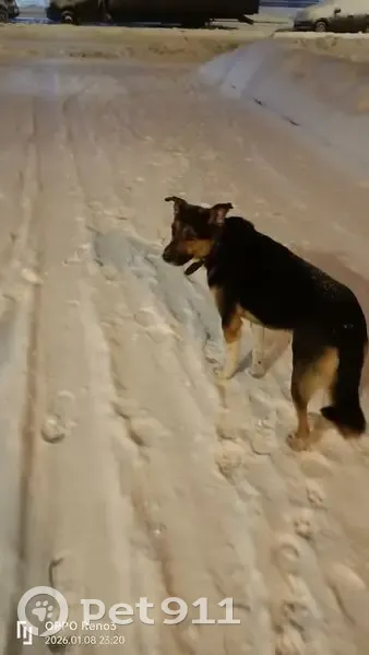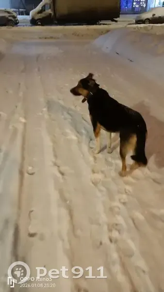 Похожа на овчарку, окрас черный, мальчик, молодой, крупная морда, в ошейнике, по характеру добрый. Бегает весь день в районе ул.Малышева, д.6.