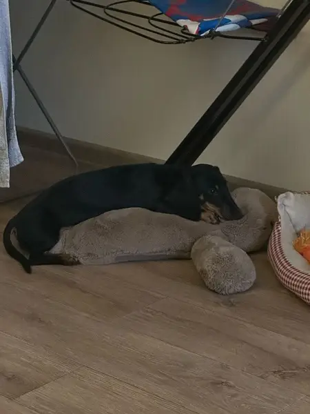Такса. Взрослый, упитанный, черный кобель . Очень дружелюбный. Наверно сильно замерз и устал . Был один в подземном переходе МЦД Курьяново. Один оставаться ника не хочет. Плачет. Не ест. Слегка расчесан возле хвоста.