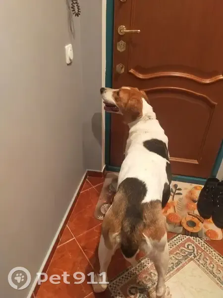 Собака девочка, предположительно эстонская гончая, в ошейнике. Прибилась к подъезду, была голодная. Выходили на улицу на поводке - собака бесцельно бродит по тропинкам. Ищет хозяина, но не понимает где искать.