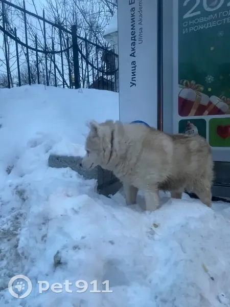 В 18:05 бегала по улице Академика Бочвара без поводка, в ошейнике.Голубые глаза, белая с коричневым