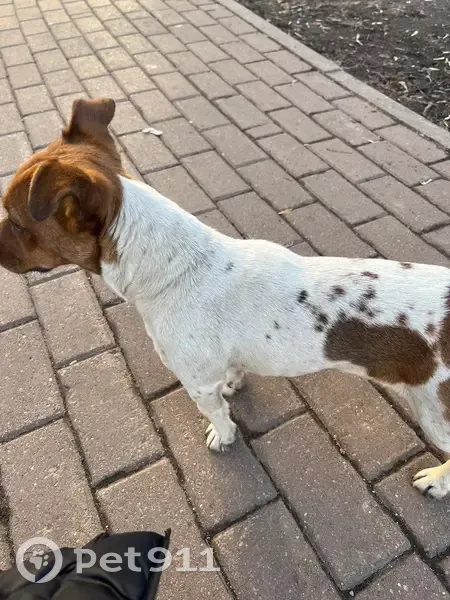 ДРТ, темная голова, пятна по телу. Дружелюбная. Без ошейника. Грязная шерсть. Видно, что уже несколько дне (?) скитается. Еду не берет. На контакт идет