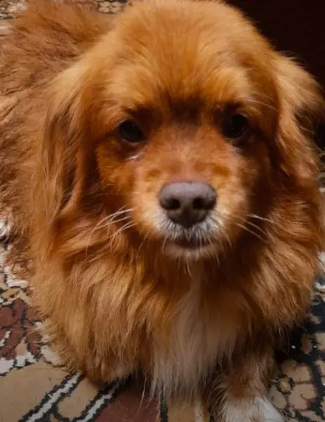 Рыжий с красной шлейкой и оборванным поводком , салатовая бирка