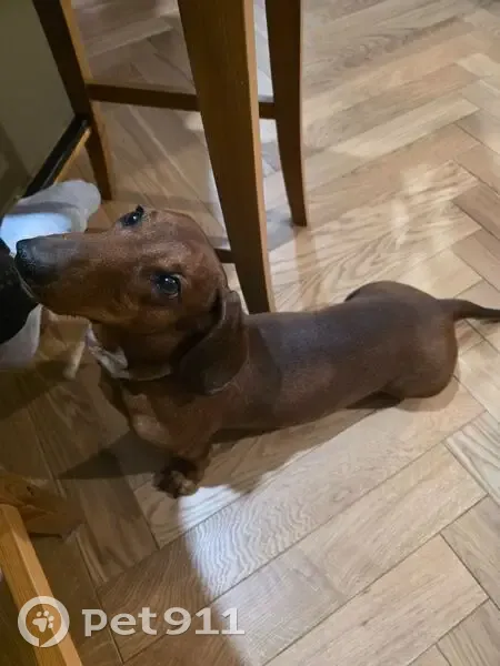 Рыжая такса, очень ухоженная с красным ошейником. Видно что за собакой очень хорошо ухаживали. Ехали на машине и приближаясь к пешеходному переходу на остановке возле кафе "Везувий" собака вышла на пешеходный переход под колеса. Осмотрелась вокруг, пытались найти хозяина но никого в округе не было. Взяли собаку к себе чтобы ее не дай бог никто не сбил или она не простудилась.