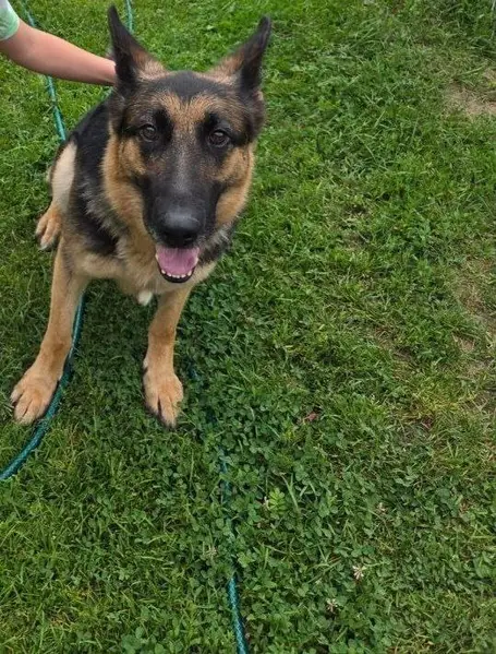 Молодая овчарка в ошейнике. Бегает по району, к людям подходит.