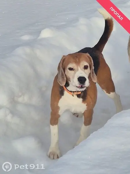Русская пеглая гончая, девочка. Возрас примерно больше 1года. На шее красный с маячком ошейник.