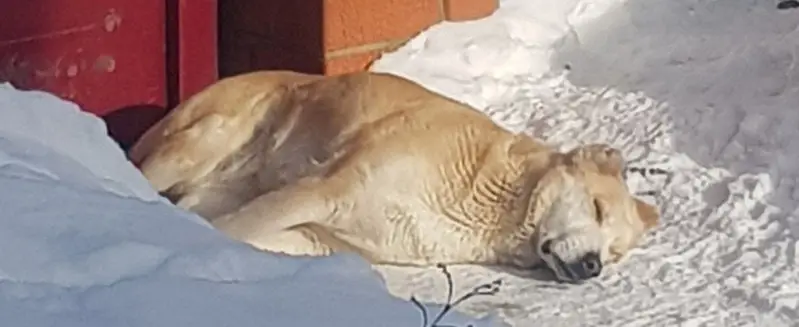 Светлый окрас, черты лабрадора, в данный момент нуждается в помощи, прихрамывает, спит на снегу, добрые и умные глаза, без ошейника,собака взрослая.