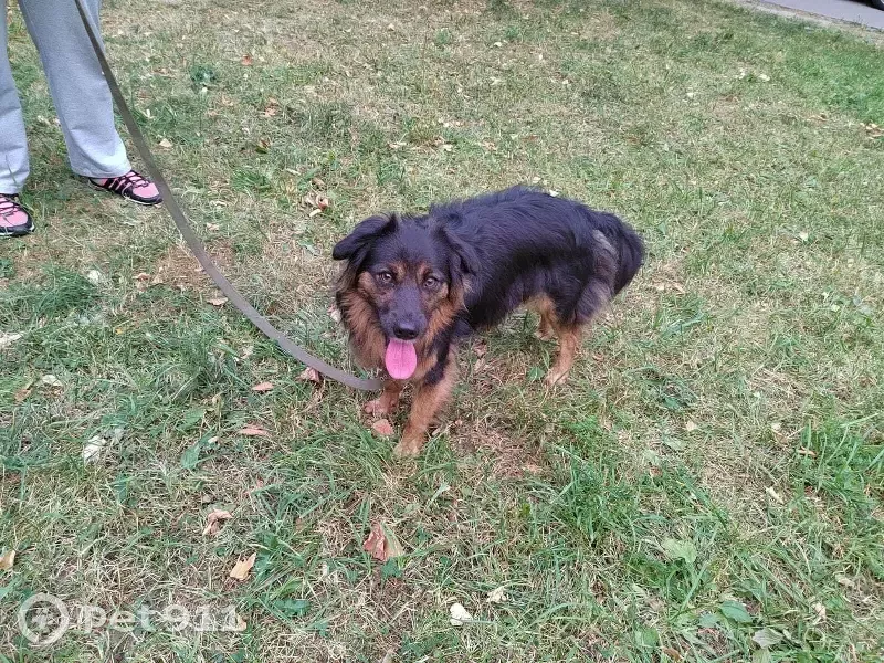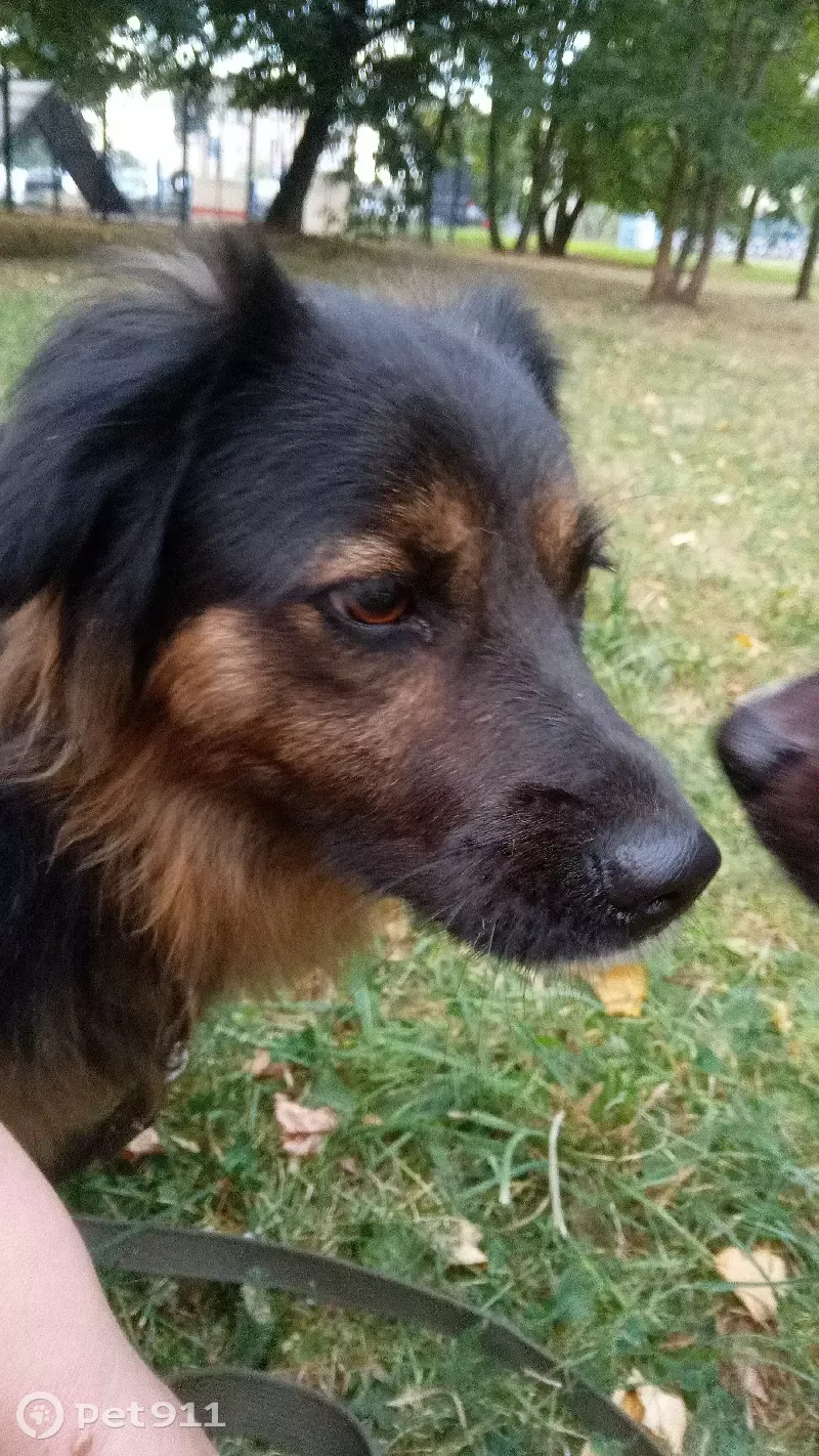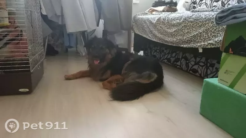 Окрас черный с подпадом, длиношерстная, уши висят. По зубам молодая. В колтунах. Не агрессивная, в квартире ведёт культурно.